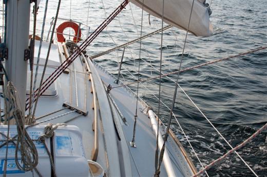 Vent de Nordet 4 Beaufort, grand-voile arisée et génois lourd, cap au 280 à plus de 5-6 noeuds, régulateur d’allure à la barre, ça pousse !